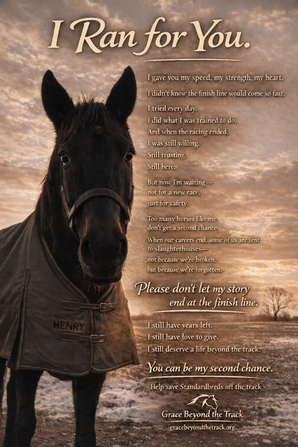 Grace Beyond The Track, Inc. is a nonprofit organization dedicated to rescuing, rehabilitating, and retraining Standardbred horses at risk of slaughter or displacement. Through professional under-saddle training, public demonstration, and lifetime-backed adoption or lease, we ensure these horses never enter auctions or slaughter pipelines and are valued for their versatility beyond racing.